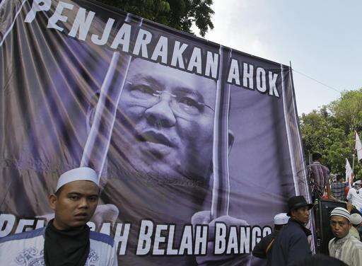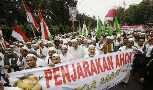 Muslim protesters display a large banner during a rally against Jakarta Governor Basuki Tjahaja Purnama, popularly known as Ahok, in Jakarta, Indonesia, Friday, Nov. 4, 2016. Tens of thousands of hard-line Muslims marched Friday on the center of the Indonesian capital to demand the arrest of the minority-Christian governor for alleged blasphemy. The banner reads: "Put Ahok in prison." (AP Photo/Achmad Ibrahim)
