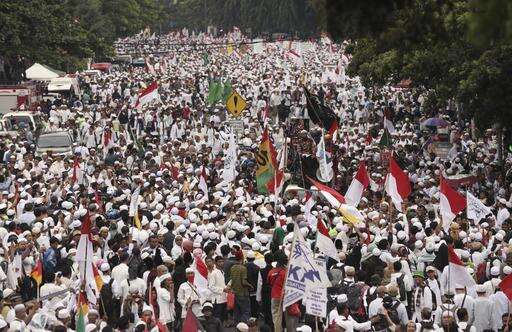 Muslim protesters march during a demonstration calling for the in Jakarta, Indonesia, Friday, Nov. 4, 2016. Thousands of hard-line Muslims converged Friday on the center of the Indonesian capital to demand the arrest of its governor for alleged blasphemy. (AP Photo/Achmad Ibrahim)