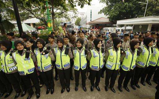 Indonesian Muslim police women guard during a protest outside of the City Hall. Friday, Nov. 4, 2016. Thousands of hard-line Muslims converged Friday on the center of the Indonesian capital to demand the arrest of its governor for alleged blasphemy. (AP Photo/Achmad Ibrahim)
