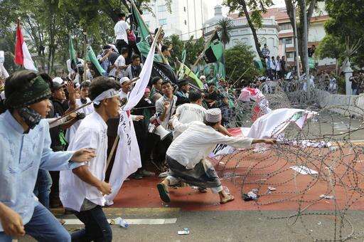 Muslim protesters pull razor wire blocking a road that leads to the presidential palace during a rally against Jakarta Governor Basuki Tjahaja Purnama in Jakarta, Indonesia, Friday, Nov. 4, 2016. Tens of thousands of hard-line Muslims marched Friday on the center of the Indonesian capital to demand the arrest of the minority-Christian governor for alleged blasphemy. (AP Photo/Tatan Syuflana)