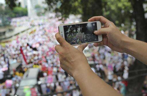 A man uses his smartphone to take photos during a rally against Jakarta Governor Basuki Tjahaja Purnama in Jakarta, Indonesia, Friday, Nov. 4, 2016. Tens of thousands of hard-line Muslims marched Friday on the center of the Indonesian capital to demand the arrest of the minority-Christian governor for alleged blasphemy. (AP Photo/Tatan Syuflana)
