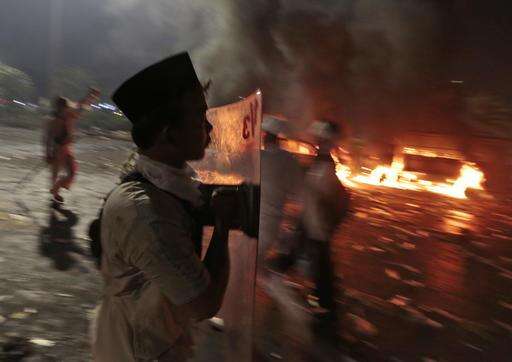 A Muslim youth carries a riot shield near burning police trucks, during a clash with the police outside the presidential palace in Jakarta, Indonesia, Friday, Nov. 4, 2016. Police in the Indonesian capital clashed with hard-line Muslim protesters refusing to disperse after a massive protest Friday to demand the arrest of the city's minority-Christian governor for alleged blasphemy. (AP Photo/Dita Alangkara)