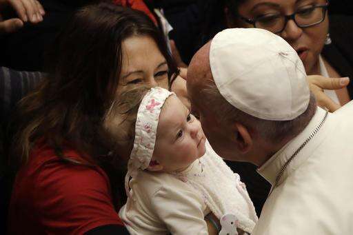 Pope Francis kisses a child at the end of an audience with representatives of the popular movements at the Vatican Saturday, Nov. 5, 2016. (AP Photo/Gregorio Borgia)