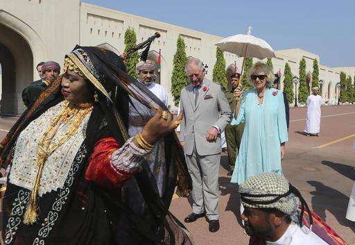 Britain's Prince Charles, center, and his wife Camilla, right, watch a group of traditional dancers in Muscat, Oman, Saturday, Nov. 5, 2016. Britain's Prince Charles and his wife Camilla have started a three-nation royal tour of the Gulf in Oman. Prince Charles landed in Muscat on Friday night, greeted at the airport by Omani Heritage and Culture Minister Sayyid Haitham Bin Tariq Al Said. Camilla landed earlier Friday. (AP Photo/Kamran Jebreili)