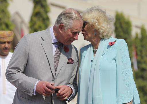 Britain's Prince Charles and his wife Camilla, Duchess of Cornwall have a moment during a ceremony in Muscat, Oman, Saturday, Nov. 5, 2016. The royal couple have started a three-nation royal tour of the Gulf in Oman. The royal couple have started a three-nation royal tour of the Gulf in Oman. (AP Photo/Kamran Jebreili)