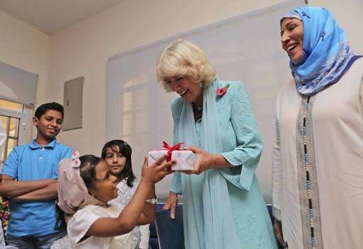 Camilla, Duchess of Cornwall, center, receives a gift from a girl at the Oman Cancer Association's Dar Al Hanan Hostel during his first day visit with her husband Prince Charles in Muscat, Oman, Saturday, Nov. 5, 2016. (AP Photo/Kamran Jebreili)