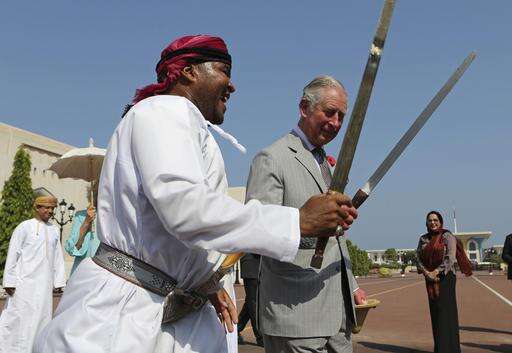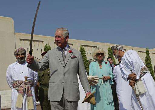 MUSCAT, Oman (AP) - Britain's Prince Charles brandished a sword and took part in a traditional dance Saturday on his trip to Oman with his wife Camilla, the first full day of the couple's three-nation royal tour of the Gulf.