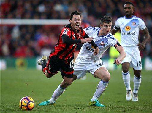 Bournemouth's Adam Smith is a tackled by Sunderland's Paddy McNair, right, during their English Premier League soccer match at the Vitality Stadium, Bournemouth, England, Saturday Nov. 5, 2016. (Steven Paston / PA via AP) The Associated Press