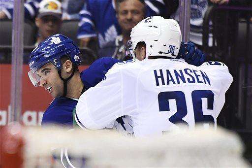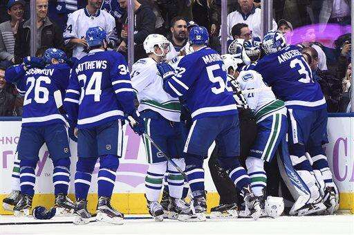It all started when Rielly caught Canucks forward Jannik Hansen with an apparent blind-side hit six-plus minutes into the final period. Trailing 5-2 at that point, the Vancouver bench erupted when there was no penalty called. Their fire bubbled higher that same shift when Kadri drilled Daniel Sedin with a left shoulder to the head area just as Sedin was scoring the Canucks' third goal.
