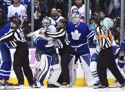 Vancouver sought that retribution with Derek Dorsett grabbing Leo Komarov for an unwanted fight off a faceoff. Dorsett howled at the Leafs and their bench afterward, restrained by an official as he made his way to the dressing room.