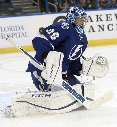 Tampa Bay Lightning goalie Ben Bishop (30) makes a save against the New Jersey Devils during the third period of an NHL hockey game Saturday, Nov. 5, 2016, in Tampa, Fla. (AP Photo/Jason Behnken) The Associated Press