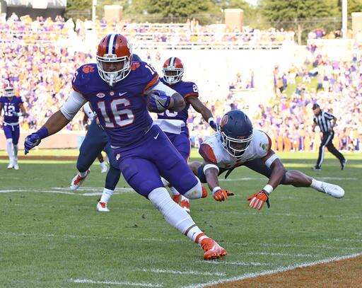 Clemson's Jordan Leggett avoids the tackle of Syracuse's Davion Ellison during the first half of an NCAA college football game, Saturday, Nov. 5, 2016, in Clemson, S.C. (AP Photo/Richard Shiro) The Associated Press