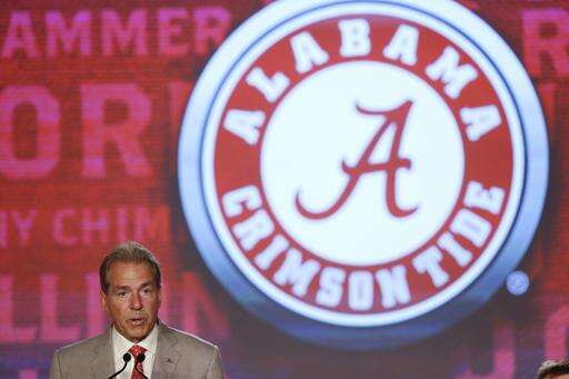 In this July 13, 2016, photo, Alabama coach Nick Saban speaks to the media at the Southeastern Conference NCAA college football media days in Hoover, Ala. At this point in the college football season, the favorites have been identified. For the third consecutive week the top six teams in The Associated Press college football poll were unchanged. (AP Photo/Brynn Anderson) The Associated Press