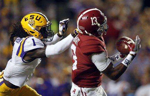 Alabama wide receiver ArDarius Stewart (13) pulls in a long pass reception in front of LSU defensive back Donte Jackson (1) in the second half of an NCAA college football game in Baton Rouge, La., Saturday, Nov. 5, 2016. Alabama won 10-0. (AP Photo/Gerald Herbert) The Associated Press