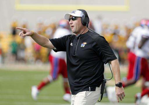 FILE - In this Oct. 15, 2016, file photo, Kansas head coach David Beaty instructs his team in the first half of an NCAA college football game against Baylor, in Waco, Texas. Kansas or Iowa State will finally win a Big 12 game this week, and that might be the only conference victory for the Jayhawks or Cyclones. For the coaches in rebuilding modes for the two teams traditionally at the bottom of the Big 12 Conference, they plan to approach Saturday’s matchup in Lawrence, Kansas, like they do every other game.(AP Photo/Tony Gutierrez, File) The Associated Press