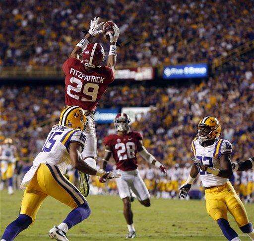 Alabama defensive back Minkah Fitzpatrick (29) breaks up a pass in front of LSU wide receiver Malachi Dupre (15) and wide receiver D.J. Chark (82) Minkah Fitzpatrickin the first half of an NCAA college football game in Baton Rouge, La., Saturday, Nov. 5, 2016. (AP Photo/Gerald Herbert) The Associated Press