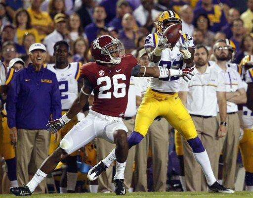 LSU wide receiver D.J. Chark (82) pulls in a long pass reception in front of Alabama defensive back Marlon Humphrey (26) in the first half of an NCAA college football game in Baton Rouge, La., Saturday, Nov. 5, 2016. (AP Photo/Gerald Herbert) The Associated Press