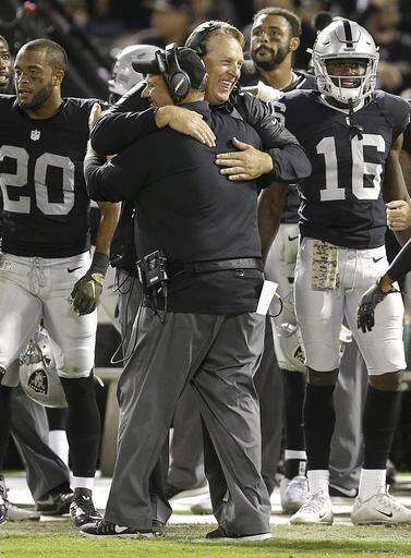 Oakland Raiders head coach Jack Del Rio, facing, hugs an assistant coach during the second half of an NFL football game against the Denver Broncos in Oakland, Calif., Sunday, Nov. 6, 2016. (AP Photo/Ben Margot) The Associated Press