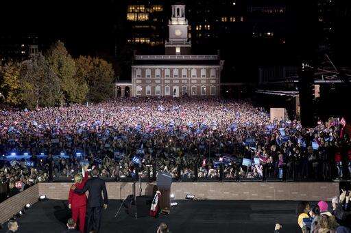 PHILADELPHIA (AP) - In the place where America's democracy took root, with tens of thousands shivering in the cold, Barack and Michelle Obama passed the torch Monday to Hillary Clinton in an emotional but anxious plea to elect her president.