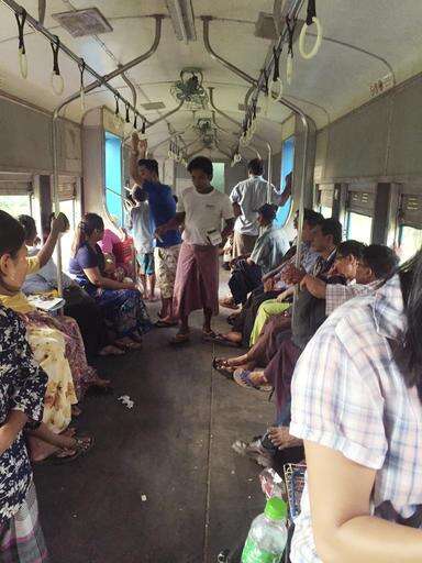 In this Oct. 2, 2016 photo, a hawker walks among passengers to sell cellphone cards on a Circle Line train in Myanmar. Myanmarâs commercial capital is fast shedding its sleepy backwater trappings as the city builds new roads, hotels and office buildings. But Yangonâs Circle Line railway is a world apart from the traffic jams and chaos of the cityâs streets. (AP Photo/Elaine Kurtenbach)