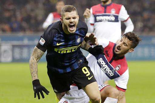 Inter Milan's Mauro Icardi, left, is challenged by Crotone's Federico Ceccherini during the Serie A soccer match between Inter Milan and Crotone at the San Siro stadium in Milan, Italy, Sunday, Nov. 6, 2016. (AP Photo/Antonio Calanni) The Associated Press