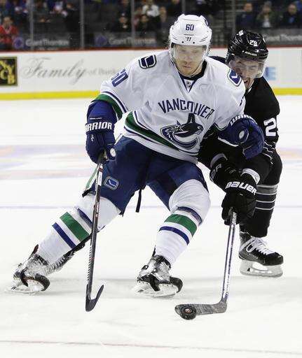 Vancouver Canucks' Alexandre Burrows (14) and New York Islanders' Adam Pelech (50) fight for control of the puck during the first period of an NHL hockey game Monday, Nov. 7, 2016, in New York. (AP Photo/Frank Franklin II) The Associated Press