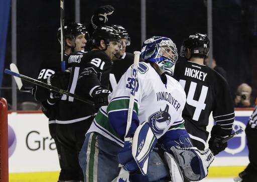 Vancouver Canucks goalie Ryan Miller (30) reacts as the New York Islanders celebrate a goal by Nikolay Kulemin during the second period of an NHL hockey game Monday, Nov. 7, 2016, in New York. (AP Photo/Frank Franklin II) The Associated Press