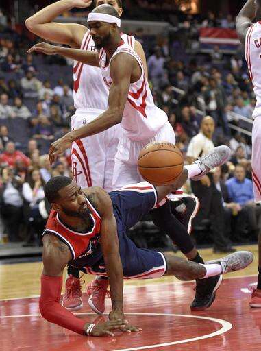 Washington Wizards guard John Wall, bottom, loses the ball against Houston Rockets forward Corey Brewer, top, during the second half of an NBA basketball game, Monday, Nov. 7, 2016, in Washington. The Rockets won 114-106. (AP Photo/Nick Wass) The Associated Press