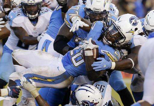 San Diego Chargers running back Melvin Gordon, center, is upended during the second half of an NFL football game against the Tennessee Titans, Sunday, Nov. 6, 2016, in San Diego. (AP Photo/Rick Scuteri) The Associated Press