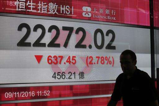 A man walks past a display of the Hang Seng Index at a bank in Hong Kong Wednesday, Nov. 9, 2016. Asian shares have shed early gains, tumbling Wednesday as Donald Trump gained the lead in the electoral vote count in the presidential election. Dow and S&P futures also plunged. Earlier, investors had appeared persuaded that Hillary Clinton, seen as a more stable choice, would prevail. (AP Photo/Kin Cheung)