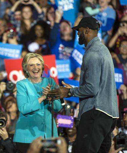 Democratic presidential candidate Hillary Clinton applauds Cleveland Cavaliers star LeBron James during a campaign rally at Cleveland Public Hall in Cleveland, Sunday, Nov. 6, 2016. (AP Photo/Phil Long) The Associated Press