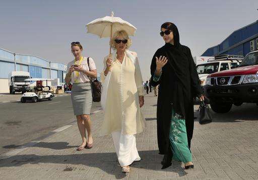 Camilla, The Duchess of Cornwall, walks with Reem Al Hashimy, UAE Minister of State and managing director of Dubai World Expo 2020, during a visit to the International Humanitarian City in Dubai, United Arab Emirates, Tuesday, Nov. 8, 2016. (AP Photo/Kamran Jebreili)