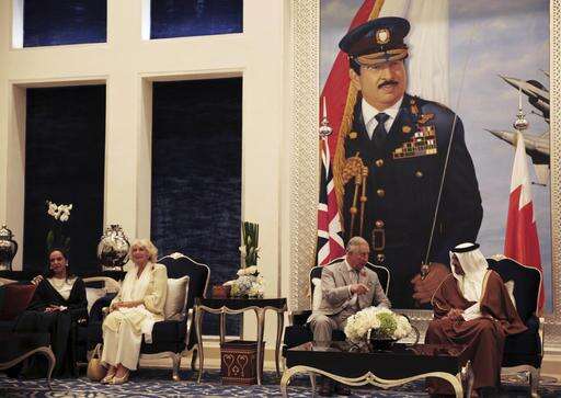 Britain's Prince Charles speaks to Bahrain's Crown Prince Salman bin Hamad bin Isa Al Khalifa, while his wife Camilla talks with Sheikh Hessa Al Khalifa in Manama, Bahrain, on Tuesday, Nov. 8, 2016. The British royal couple are on a three-nation tour of the Gulf. Bahrain's King Hamad bin Isa Al Khalifa is pictured in the painting behind them. (AP Photo/Jon Gambrell)