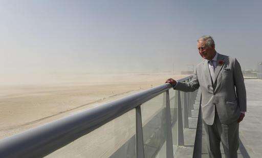 Britain's Prince Charles takes a look at the site planned for Expo 2020, in Dubai, United Arab Emirates, Tuesday, Nov. 8, 2016. Prince Charles and Camilla will travel to Bahrain on Tuesday, the last leg of their weeklong three-nation tour of the Gulf after earlier visiting Oman. (AP Photo/Kamran Jebreili)