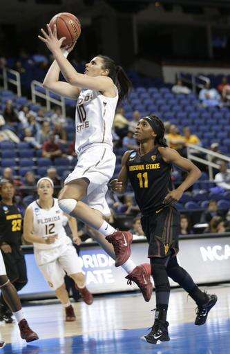 FILE - In this March 27, 2015, file photo, Florida State's Leticia Romero (10) drives past Arizona State's Peace Amukamara (11) in the second half of a women's college basketball regional semifinal game in the NCAA Tournament in Greensboro, N.C. Leticia Romero couldn't believe the celebrity status she achieved back home in the Canary Islands. That's what happens when you win a medal for Spain at the Olympics. Florida State's star is hoping for similiar success in her senior season with the Seminoles. (AP Photo/Chuck Burton, File) The Associated Press