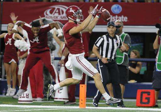 FILe - In this Sept. 3, 2016, file photo, Alabama wide receiver Gehrig Dieter celebrates as he crosses into the end zone after catching a pass during the second half of an NCAA college football game against Southern California, in Arlington, Texas. Teams across the league are sprinkled with players who moved into the SEC as graduate students after careers at other schools. Dieter transferred from Bowling Green. (AP Photo/Tony Gutierrez, File) The Associated Press