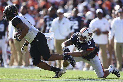 In this Saturday, Nov. 5, 2016, photo, Vanderbilt wide receiver C.J. Duncan (19) gets away from Auburn linebacker T.J. Neal (17) during the second half of an NCAA college football game at Jordan-Hare Stadium in Auburn, Ala. Teams across the league are sprinkled with players who moved into the SEC as graduate students after careers at other schools. Neal transferred from Illinois. (Julie Bennett/AL.com via AP) The Associated Press