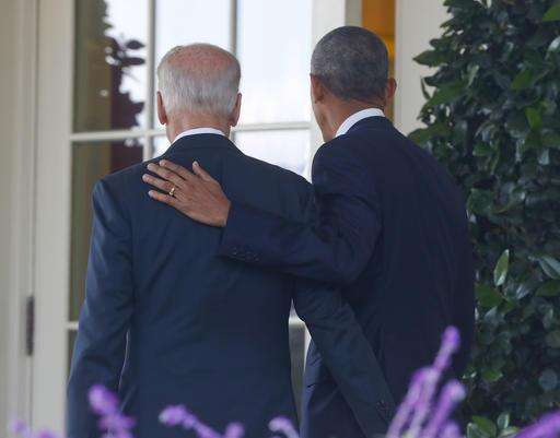 President Barack Obama, accompanied by Vice President Joe Biden, walks back into the Oval Office of the White House in Washington, Wednesday, Nov. 9, 2016, after speaking about the election in the Rose Garden. (AP Photo/Pablo Martinez Monsivais The Associated Press