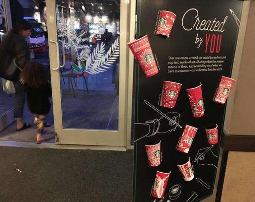 For the holiday cups, the company said it received 1,200 designs from customers online and narrowed them down. All the cups for hot drinks are red and have white designs featuring candy canes, ornaments or other holiday symbols. The one cup for iced drinks has a wreath wrapped around the Starbucks mermaid logo.