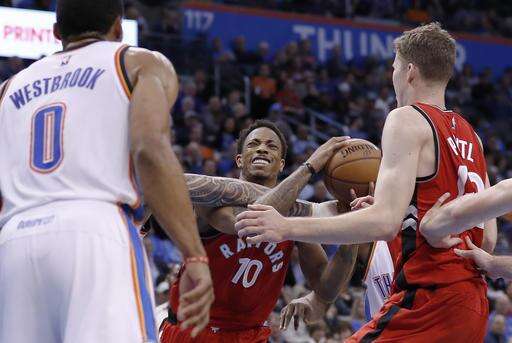 OKLAHOMA CITY (AP) - DeMar DeRozan scored 37 points to help the Toronto Raptors beat the Oklahoma City Thunder 112-102 on Wednesday night.