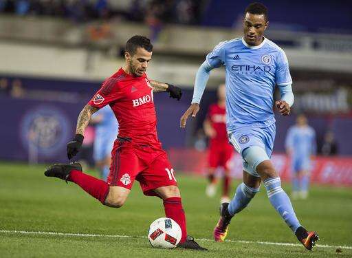 Toronto FC Sebastian Giovinco (10), left scores his third goal during a MLS second leg eastern semifinals soccer match against New York City FC in New York, Sunday, Nov. 6, 2016. (AP Photo/Andres Kudacki) The Associated Press