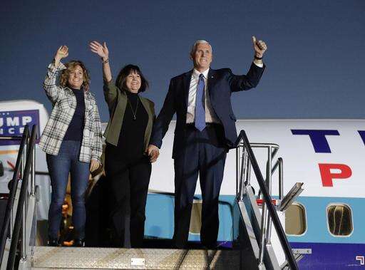 Vice President-elect Mike Pence with his wife, Karen, and daughter, Charlotte, acknowledge supporters as they get off a plane after arriving for a public rally Thursday, Nov. 10, 2016, in Indianapolis. (AP Photo/Darron Cummings) The Associated Press