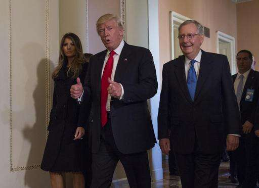 President-elect Donald Trump, flanked by his wife Melania and Senate Majority Leader Mitch McConnell of Ky., gives a thumbs-up while walking on Capitol Hill in Washington, Thursday, Nov. 10, 2016, after their meeting. (AP Photo/Molly Riley) The Associated Press