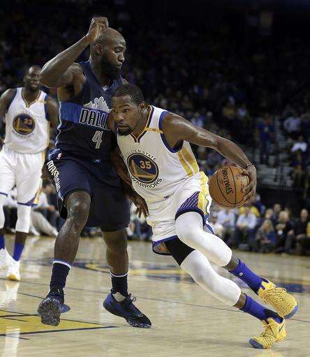 Golden State Warriors' Kevin Durant, right, drives against Dallas Mavericks' Quincy Acy (4) during the second half of an NBA basketball game Wednesday, Nov. 9, 2016, in Oakland, Calif. (AP Photo/Ben Margot) The Associated Press
