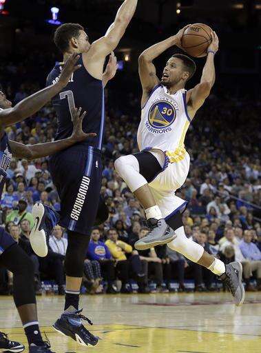 Golden State Warriors' Stephen Curry, right, shoots against Dallas Mavericks' Dwight Powell (7) during the second half of an NBA basketball game Wednesday, Nov. 9, 2016, in Oakland, Calif. (AP Photo/Ben Margot) The Associated Press