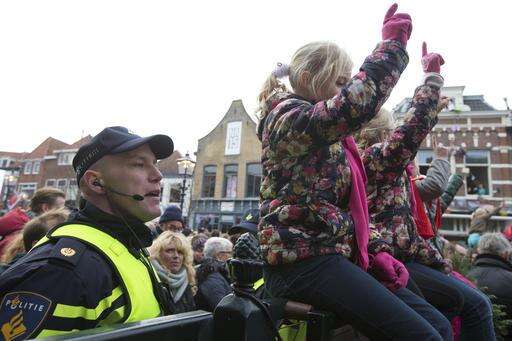 A police officer keeps an eye on the crowd as children gesture while singing songs during the arrival of Sinterklaas, or Saint Nicholas, in Maassluis, Netherlands, Saturday, Nov. 12, 2016. Sinterklaas and his helper Black Pete are at the center of a long-time controversy because Pete is often played by white people in blackface makeup. (AP Photo/Peter Dejong) The Associated Press