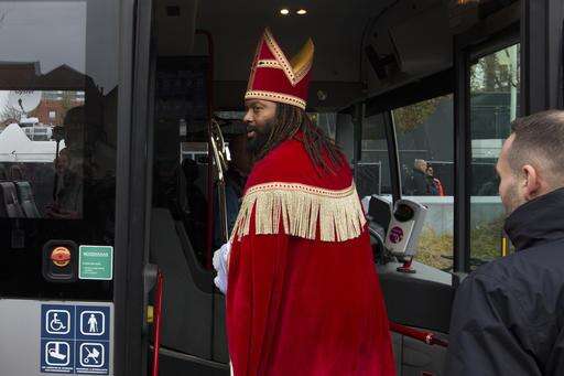 Patrick Mathurin, who plays Sinterklaas gets on a bus after being refused access to celebrations marking the arrival of Sinterklaas, or Saint Nicholas, in Maassluis, Netherlands, Saturday, Nov. 12, 2016. Sinterklaas, normally played by a white actor, and his helper Black Pete are at the center of a long-time controversy because Pete is often played by white people in blackface makeup. (AP Photo/Peter Dejong) The Associated Press