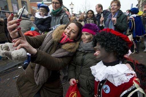 A mother takes a selfie with her daughter and a Black Pete during the arrival of Sinterklaas, the Dutch Saint Nicholas, in Maassluis, Netherlands, Saturday, Nov. 12, 2016. Sinterklaas and his helper Black Pete are at the center of a long-time controversy because Pete is often played by white people in blackface makeup. (AP Photo/Peter Dejong) The Associated Press