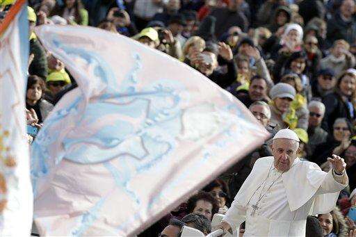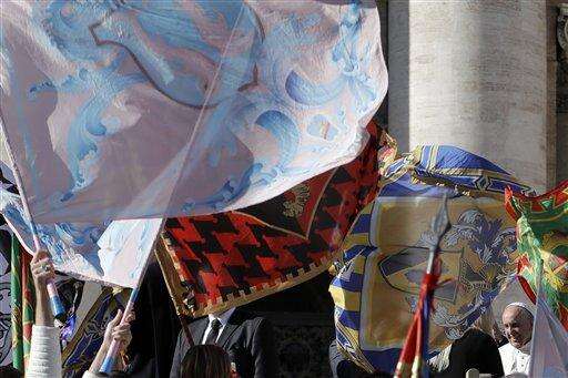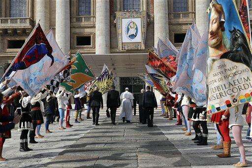 Pope Francis, right, is framed by flags of the Italian village of Fucecchio during a Jubilee audience in St. Peter's Square, at the Vatican, Saturday, Nov. 12, 2016. (AP Photo/Gregorio Borgia)