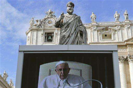 The statue of St. Peter towers over a screen which is broadcasting Pope Francis reading his message during a Jubilee audience in St. Peter's Square, at the Vatican, Saturday, Nov. 12, 2016. (AP Photo/Gregorio Borgia)